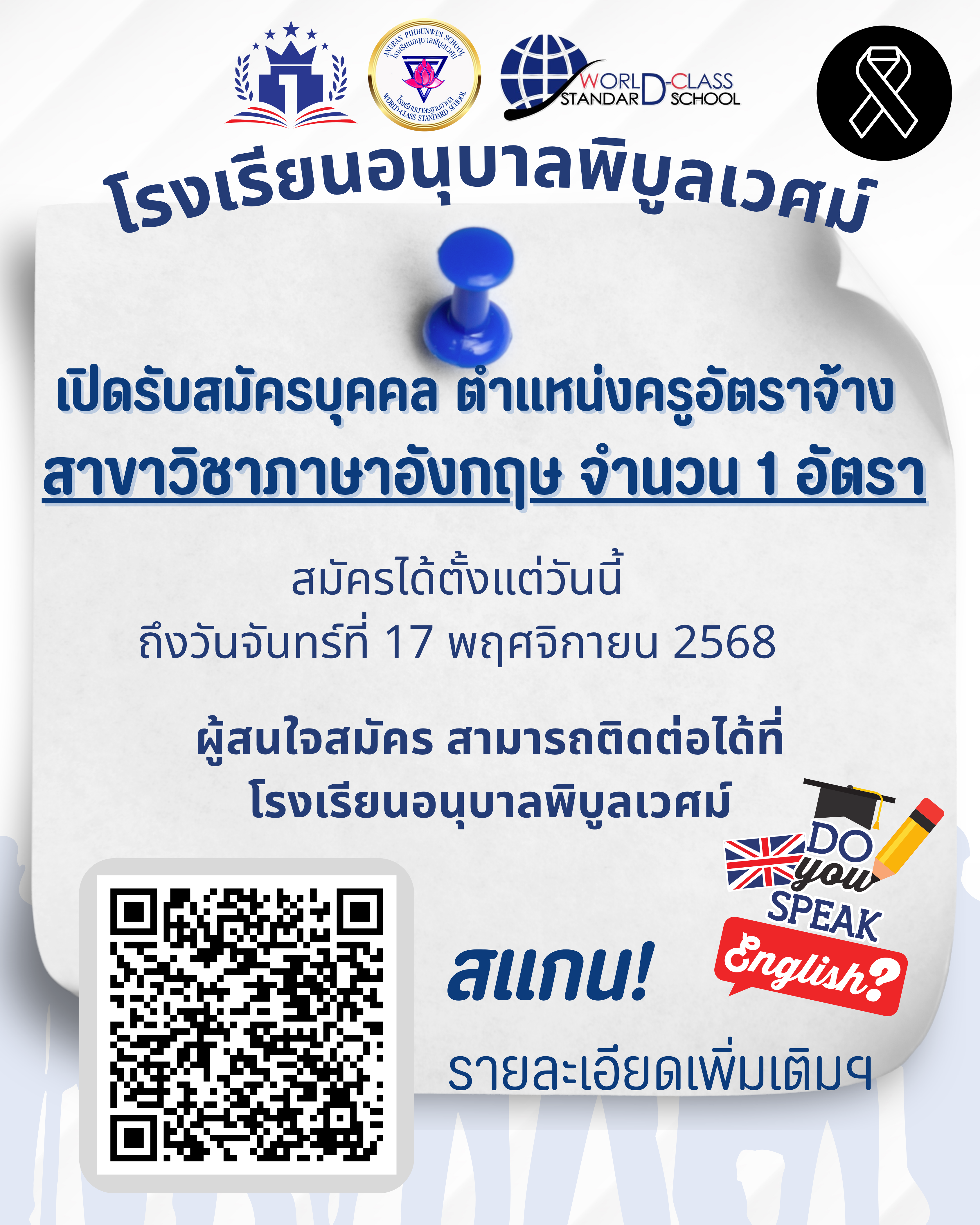 รับสมัครครูตำแหน่ง1.สาขาวิชา ภาษาอังกฤษ 1 อัตรา ยื่นสมั […]
