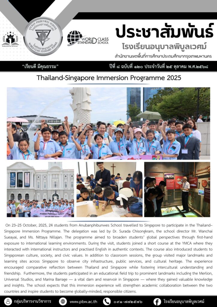 On 23–25 October 2025, 24 students from Anubanphibunwes School travelled to Singapore to participate in the Thailand–Singapore Immersion Programme. The delegation was led by Dr. Surada Chisongkram, school director Mr. Wanchai Sueayai, and Ms. Nittaya Nillajan. The programme aimed to broaden students’ global perspectives through first-hand exposure to international learning environments. During the visit, students joined a short course at the YMCA, where they interacted with international instructors and practised English in authentic contexts. The course also introduced students to Singaporean culture, society, and civic values.