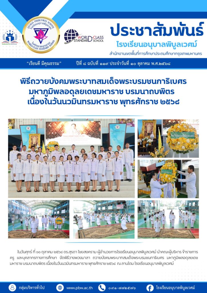 ในวันศุกร์ ที่ ๑๐ ตุลาคม ๒๕๖๘ ดร.สุรดา ไชยสงคราม ผู้อำนวยการโรงเรียนอนุบาลพิบูลเวศม์ นำคณะผู้บริหาร ข้าราชการครู และบุคลากรทางการศึกษา จัดพิธีวางพวงมาลา ถวายบังคมพระบาทสมเด็จพระบรมชนกาธิเบศร มหาภูมิพลอดุลยเดชมหาราช บรมนาถบพิตร เนื่องในวันนวมินทรมหาราช พุทธศักราช ๒๕๖๘ ณ ลานโดม โรงเรียนอนุบาลพิบูลเวศม์
