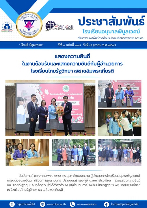 วันอังคารที่ ๗ ตุลาคม พ.ศ. ๒๕๖๘ ดร.สุรดา ไชยสงคราม ผู้อำนวยการโรงเรียนอนุบาลพิบูลเวศม์ พร้อมด้วยนางจินดา ศิริวงศ์ เเละนายนคร ปราบมนตรี รองผู้อำนวยการโรงเรียน ร่วมเเสดงความยินดีกับ นายณัฐกฤษ จันทร์คณา ซึ่งได้ดำรงตำแหน่งผู้อำนวยการโรงเรียนไทยรัฐวิทยา ๗๕ เฉลิมพระเกียรติ ณ โรงเรียนไทยรัฐวิทยา ๗๕ เฉลิมพระเกียรติ