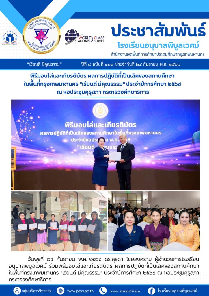 ผู้อำนวยการโรงเรียนอนุบาลพิบูลเวศม์ ร่วมพิธีมอบโล่และเกียรติบัตร ผลการปฏิบัติที่เป็นเลิศของสถานศึกษาในพื้นที่กรุงเทพมหานคร “เรียนดี มีคุณธรรม” ประจำปีการศึกษา ๒๕๖๘ 24 กันยายน 20253 พฤศจิกายน 2025 ปรัชญาพล เจริญรักษ์ PBE NEWS, ประชาสัมพันธ์, ผลงานครู, ภาพกิจกรรมโรงเรียน, เผยแพร่ผลงานวิชาการ วันพุธที่ ๒๔ กันยายน พ.ศ. ๒๕๖๘ ดร.สุรดา ไชยสงคราม ผู้อำนวยการโรงเรียนอนุบาลพิบูลเวศม์ ร่วมพิธีมอบโล่และเกียรติบัตร ผลการปฏิบัติที่เป็นเลิศของสถานศึกษาในพื้นที่กรุงเทพมหานคร “เรียนดี มีคุณธรรม” ประจำปีการศึกษา ๒๕๖๘ ณ หอประชุมคุรุสภา กระทรวงศึกษาธิการ จำนวนผู้เช้าชม : 4 Facebook iconFacebookTwitter iconTwitterLINE iconLine ปรัชญาพล เจริญรักษ์