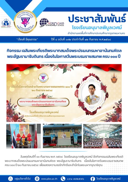 กิจกรรมเฉลิมพระเกียรติพระบาทสมเด็จพระปรเมนทรมหาอานันทมหิดล พระอัฐมรามาธิบดินทร เนื่องในโอกาสวันพระบรมราชสมภพ ครบ ๑๐๐ ปี ๒๐ กันยายน ๒๕๖๘ 11 กันยายน 20253 พฤศจิกายน 2025 ปรัชญาพล เจริญรักษ์ PBE NEWS, ประชาสัมพันธ์, ภาพกิจกรรมโรงเรียน วันพฤหัสบดีที่ ๑๑ กันยายน พ.ศ. ๒๕๖๘ โรงเรียนอนุบาลพิบูลเวศม์ จัดกิจกรรมเฉลิมพระเกียรติพระบาทสมเด็จพระปรเมนทรมหาอานันทมหิดล พระอัฐมรามาธิบดินทร เนื่องในโอกาสวันพระบรมราชสมภพ ครบ ๑๐๐ ปี ๒๐ กันยายน ๒๕๖๘ เพื่อแสดงความจงรักภักดีและสำนึกในพระมหากรุณาธิคุณ จำนวนผู้เช้าชม : 3 Facebook iconFacebookTwitter iconTwitterLINE iconLine ปรัชญาพล เจริญรักษ์