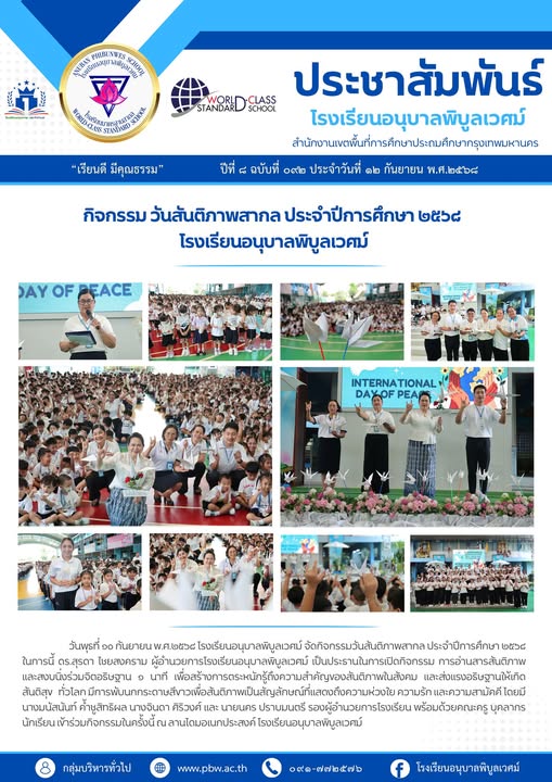วันพุธที่ ๑๐ กันยายน พ.ศ.๒๕๖๘ โรงเรียนอนุบาลพิบูลเวศม์ จัดกิจกรรมวันสันติภาพสากล ประจำปีการศึกษา ๒๕๖๘ ในการนี้ ดร.สุรดา ไชยสงคราม ผู้อำนวยการโรงเรียนอนุบาลพิบูลเวศม์ เป็นประธานในการเปิดกิจกรรม การอ่านสารสันติภาพ และสงบนิ่งร่วมจิตอธิษฐาน ๑ นาที เพื่อสร้างการตระหนักรู้ถึงความสำคัญของสันติภาพในสังคม และส่งแรงอธิษฐานให้เกิดสันติสุข ทั่วโลก มีการพับนกกระดาษสีขาวเพื่อสันติภาพเป็นสัญลักษณ์ที่แสดงถึงความห่วงใย ความรัก และความสามัคคี โดยมีนางมนัสนันท์ ค้ำชูสิทธิผล นางจินดา ศิริวงศ์ และ นายนคร ปราบมนตรี รองผู้อำนวยการโรงเรียน พร้อมด้วยคณะครู บุคลากร นักเรียน เข้าร่วมกิจกรรมในครั้งนี้ ณ ลานโดมอเนกประสงค์ โรงเรียนอนุบาลพิบูลเวศม์