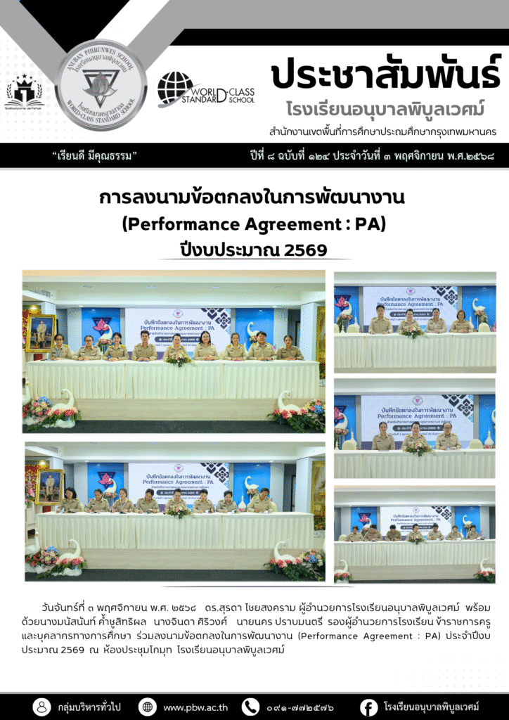 วันจันทร์ที่ ๓ พฤศจิกายน พ.ศ. ๒๕๖๘ ดร.สุรดา ไชยสงคราม ผู้อำนวยการโรงเรียนอนุบาลพิบูลเวศม์ พร้อมด้วยนางมนัสนันท์ ค้ำชูสิทธิผล นางจินดา ศิริวงศ์ นายนคร ปราบมนตรี รองผู้อำนวยการ ข้าราชการครูและบุคลากรโรงเรียน ร่วมลงนามข้อตกลงในการพัฒนางาน (Performance Agreement : PA) ประจำปีงบประมาณ 2569 ณ ห้องประชุมโกมุท โรงเรียนอนุบาลพิบูลเวศม์