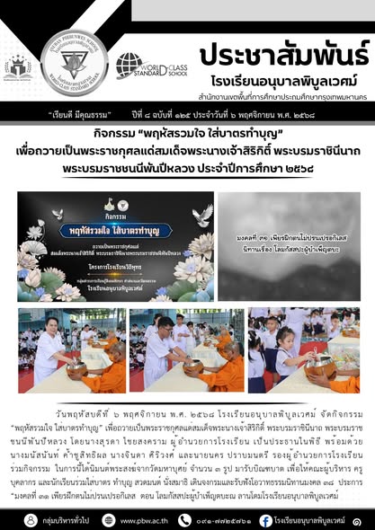 วันพฤหัสบดีที่ ๖ พฤศจิกายน พ.ศ. ๒๕๖๘ โรงเรียนอนุบาลพิบูลเวศม์ จัดกิจกรรม “พฤหัสรวมใจ ใส่บาตรทำบุญ” เพื่อถวายเป็นพระราชกุศลแด่สมเด็จพระนางเจ้าสิริกิติ์ พระบรมราชินีนาถ พระบรมราชชนนีพันปีหลวง โดยนางสุรดา ไชยสงคราม ผู้อำนวยการโรงเรียน เป็นประธานในพิธี พร้อมด้วย นางมนัสนันท์ ค้ำชูสิทธิผล นางจินดา ศิริวงศ์ และนายนคร ปราบมนตรี รองผู้อำนวยการโรงเรียน ร่วมกิจกรรม ในการนี้ได้นิมนต์พระสงฆ์จากวัดมหาบุศย์ จำนวน ๓ รูป มารับบิณฑบาต เพื่อให้คณะผู้บริหาร ครู บุคลากร และนักเรียนร่วมใส่บาตร ทำบุญ สวดมนต์ นั่งสมาธิ เดินจงกรมและรับฟังโอวาทธรรมนิทานมงคล ๓๘ ประการ “มงคลที่ ๓๑ เพียรฝึกตนไม่ปรนเปรอกิเลส ตอน โลมกัสสปะผู้บำเพ็ญตบะณ ลานโดมโรงเรียนอนุบาลพิบูลเวศม์