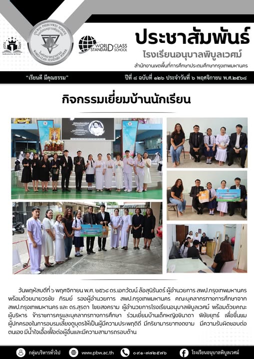 วันพฤหัสบดีที่ ๖ พฤศจิกายน พ.ศ. ๒๕๖๘ ดร.เอกวัฒน์ ล้อสุนิรันดร์ ผู้อำนวยการ สพป.กรุงเทพมหานคร พร้อมด้วยนายวรชัย ภิรมย์ รองผู้อำนวยการ สพป.กรุงเทพมหานคร คณะบุคลากรทางการศึกษาจาก สพป.กรุงเทพมหานคร เเละ ดร.สุรดา ไชยสงคราม ผู้อำนวยการโรงเรียนอนุบาลพิบูลเวศม์ พร้อมด้วยคณะผู้บริหาร คณะครูและบุคลากรทางการศึกษา ร่วมเยี่ยมบ้านเด็กหญิงชินาดา พิชัยยุทธ์ เพื่อชื่นชมผู้ปกครองในการอบรมเลี้ยงดูบุตรให้เป็นผู้มีความประพฤติดี มีกริยามารยาทงดงาม มีความรับผิดชอบต่อตนเอง มีน้ำใจ เอื้อเฟื้อต่อผู้อื่นเเละมีความสามารถรอบด้าน