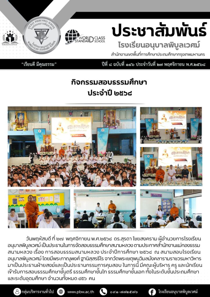 วันพฤหัสบดี ที่ ๒๗ พฤศจิกายน พ.ศ.๒๕๖๘ ดร.สุรดา ไชยสงคราม ผู้อำนวยการโรงเรียนอนุบาลพิบูลเวศม์ ประธานจัดสอบธรรมศึกษาสนามหลวง ตามประกาศสำนักงานแม่กองธรรมสนามหลวง เรื่อง การสอบธรรมสนามหลวง ประจำปีการศึกษา ๒๕๖๘ ณ สนามสอบโรงเรียนอนุบาลพิบูลเวศม์ โดยมีพระภาณุพงศ์ ฐานิสฺสรธีโร จากวัดพระเชตุพนวิมลมังคลาราม ราชวรมหาวิหาร มาเป็นประธานฝ่ายสงฆ์และเป็นประธานกรรมการคุมสอบ ในการนี้ มีคณะผู้บริหาร ครู และนักเรียน เข้ารับการสอบธรรมศึกษาชั้นตรี ธรรมศึกษาชั้นโท ธรรมศึกษาชั้นเอก ทั้งในระดับชั้นประถมศึกษา และระดับอุดมศึกษา จำนวนทั้งหมด ๔๕๖ คน