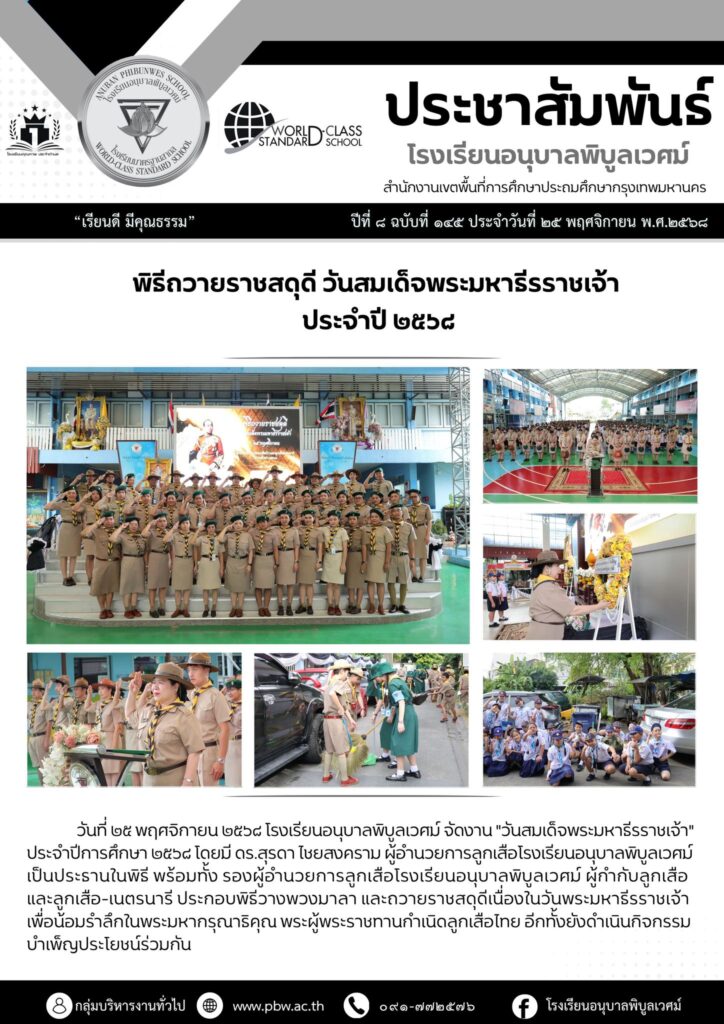 วันที่ ๒๕ พฤศจิกายน ๒๕๖๘ โรงเรียนอนุบาลพิบูลเวศม์ จัดงาน “”วันสมเด็จพระมหาธีรราชเจ้า”” ประจำปีการศึกษา ๒๕๖๘ โดยมี ดร.สุรดา ไชยสงคราม ผู้อำนวยการลูกเสือโรงเรียนอนุบาลพิบูลเวศม์เป็นประธานในพิธี และรองผู้อำนวยการลูกเสือโรงเรียนอนุบาลพิบูลเวศม์ ผู้กำกับลูกเสือ ลูกเสือ-เนตรนารี ประกอบพิธีวางพวงมาลา และถวายราชสดุดี เพื่อน้อมรำลึกในพระมหากรุณาธิคุณ ในการพระราชทานกำเนิดลูกเสือไทย และปฏิบัติกิจกรรมบำเพ็ญประโยชน์ร่วมกัน