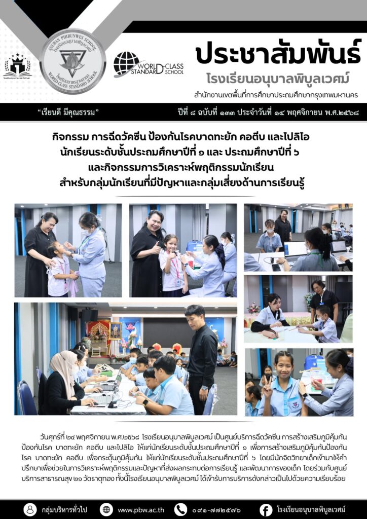 วันศุกร์ที่ ๒๔ พฤศจิกายน พ.ศ.๒๕๖๘ โรงเรียนอนุบาลพิบูลเวศม์ เป็นศูนย์บริการฉีดวัคซีน การสร้างเสริมภูมิคุ้มกันป้องกันโรค บาดทะยัก คอตีบ และโปลิโอ ให้แก่นักเรียนระดับชั้นประถมศึกษาปีที่ ๑ เพื่อการสร้างเสริมภูมิคุ้มกันป้องกันโรค บาดทะยัก คอตีบ เพื่อกระตุ้นภูมิคุ้มกัน ให้แก่นักเรียนระดับชั้นประถมศึกษาปีที่ ๖ โดยมีนักจิตวิทยาเด็กเข้ามาให้คำปรึกษาเพื่อช่วยในการวิเคราะห์พฤติกรรมและปัญหาที่ส่งผลกระทบต่อการเรียนรู้ และพัฒนาการของเด็ก โดยร่วมกับศูนย์บริการสาธารณสุข ๒๑ วัดธาตุทอง ทั้งนี้โรงเรียนอนุบาลพิบูลเวศม์ ได้เข้ารับการบริการดังกล่าวเป็นไปด้วยความเรียบร้อย