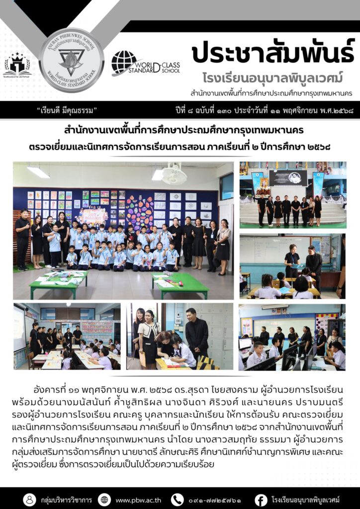 อังคารที่ ๑๑ พฤศจิกายน พ.ศ. ๒๕๖๘ ดร.สุรดา ไชยสงคราม ผู้อำนวยการโรงเรียน พร้อมด้วยนางมนัสนันท์ ค้ำชูสิทธิผล นางจินดา ศิริวงศ์ และนายนคร ปราบมนตรี รองผู้อำนวยการโรงเรียน คณะครู บุคลากรและนักเรียน ให้การต้อนรับ คณะตรวจเยี่ยม และนิเทศการจัดการเรียนการสอน ภาคเรียนที่ ๒ ปีการศึกษา ๒๕๖๘ จากสำนักงานเขตพื้นที่การศึกษาประถมศึกษากรุงเทพมหานคร นำโดย นางสาวสมฤทัย ธรรมมา ผู้อำนวยการ กลุ่มส่งเสริมการจัดการศึกษา นายชาตรี ลักษณะศิริ ศึกษานิเทศก์ชำนาญการพิเศษ และคณะผู้ตรวจเยี่ยม ซึ่งการตรวจเยี่ยมเป็นไปด้วยความเรียบร้อย