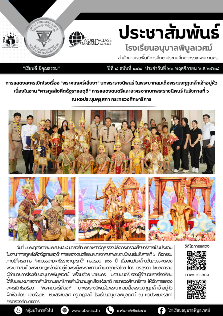 วันที่ ๒๖ พฤศจิกายน พ.ศ. ๒๕๖๘ ดร.สุรดา ไชยสงคราม ผู้อำนวยการโรงเรียนอนุบาลพิบูลเวศม์ พร้อมด้วย นางมนัสนันท์ ค้ำชูสิทธิผล นายนคร ปราบมนตรี รองผู้อำนวยการโรงเรียน ได้รับมอบหมายจากสำนักงานเลขาธิการสำนักงานลูกเสือแห่งชาติ กระทรวงศึกษาธิการ ให้จัดการแสดง “ศารทูลสังคีตฉัฐราชสดุดี” การแสดงดนตรีและละครจากบทพระราชนิพนธ์ ในรัชกาลที่ ๖ ภายใต้โครงการ “ศตวรรษามหาธีรราชานุสรณ์” ครบรอบ ๑๐๐ ปี เนื่องในวันคล้ายวันสวรรคตของพระบาทสมเด็จพระมงกุฎเกล้าเจ้าอยู่หัว พระผู้พระราชทานกำเนิดลูกเสือไทย ณ หอประชุมคุรุสภา กระทรวงศึกษาธิการ