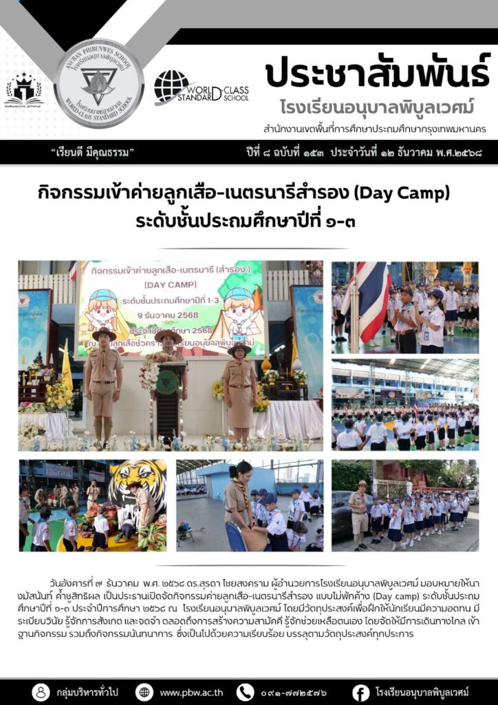 วันอังคารที่ ๙ ธันวาคม พ.ศ. ๒๕๖๘ ดร.สุรดา ไชยสงคราม ผู้อำนวยการโรงเรียนอนุบาลพิบูลเวศม์ มอบหมายให้นางมัสนันท์ ค้ำชูสิทธิผล เป็นประธานเปิดจัดกิจกรรมค่ายลูกเสือ-เนตรนารีสำรอง แบบไม่พักค้าง (Day camp) ระดับชั้นประถมศึกษาปีที่ ๑-๓ ประจำปีการศึกษา ๒๕๖๘ ณ โรงเรียนอนุบาลพิบูลเวศม์ โดยมีวัตถุประสงค์เพื่อฝึกให้นักเรียนมีความอดทน มีระเบียบวินัย รู้จักการสังเกต และจดจำ ตลอดถึงการสร้างความสามัคคี รู้จักช่วยเหลือตนเอง โดยจัดให้มีการเดินทางไกล เข้าฐานกิจกรรม รวมถึงกิจกรรมนันทนาการ ซึ่งเป็นไปด้วยความเรียบร้อย บรรลุตามวัตถุประสงค์ทุกประการ
